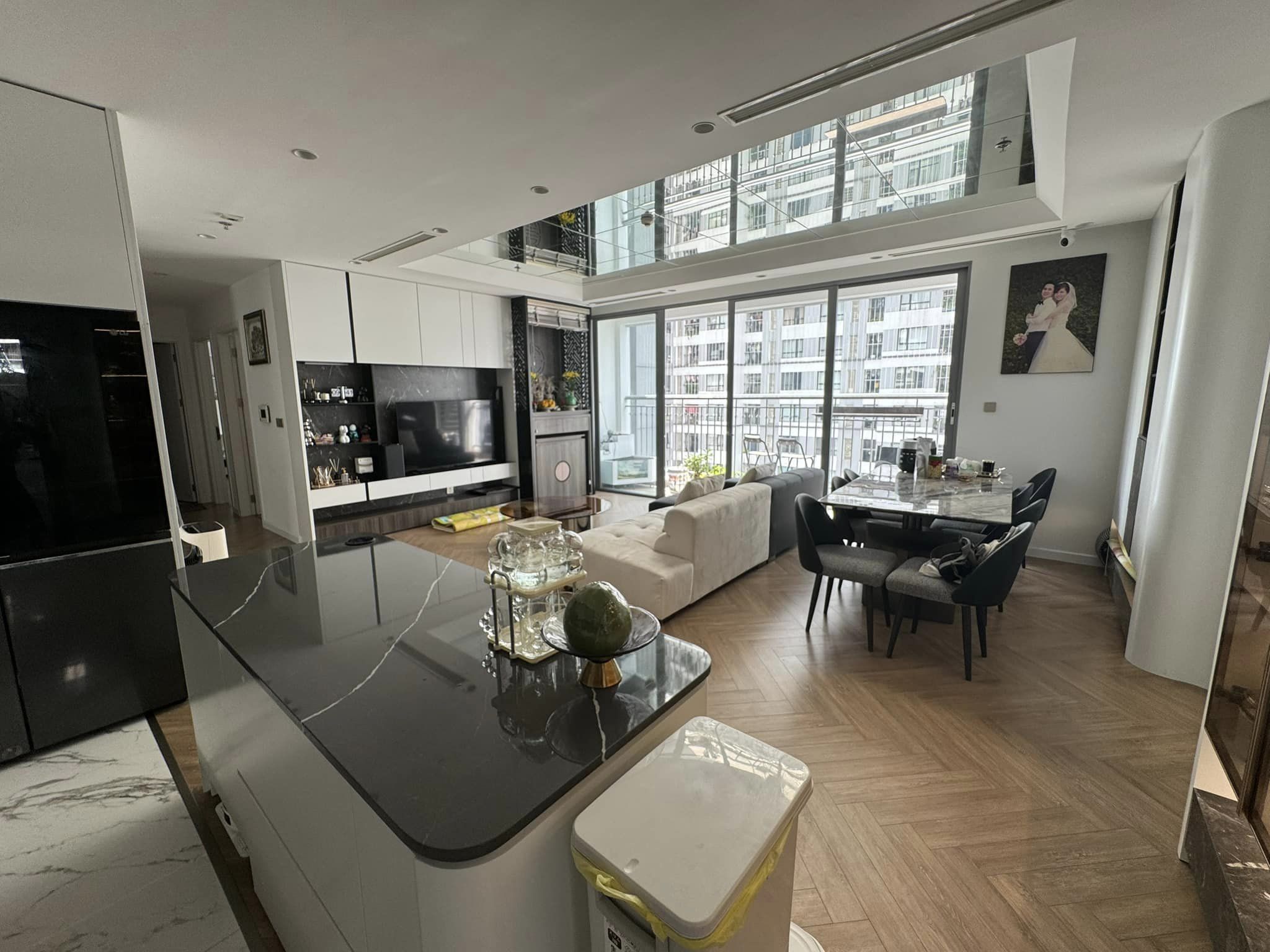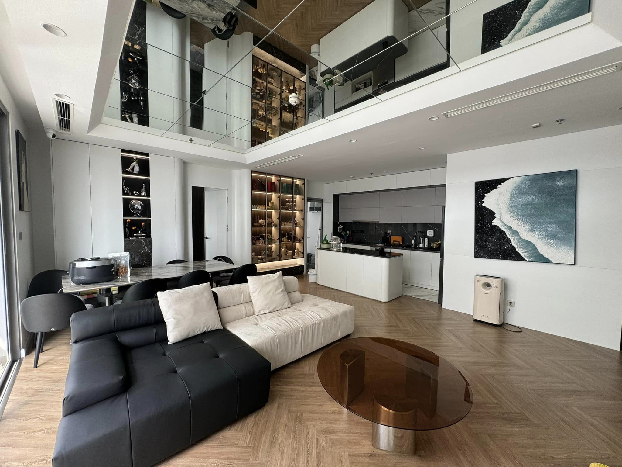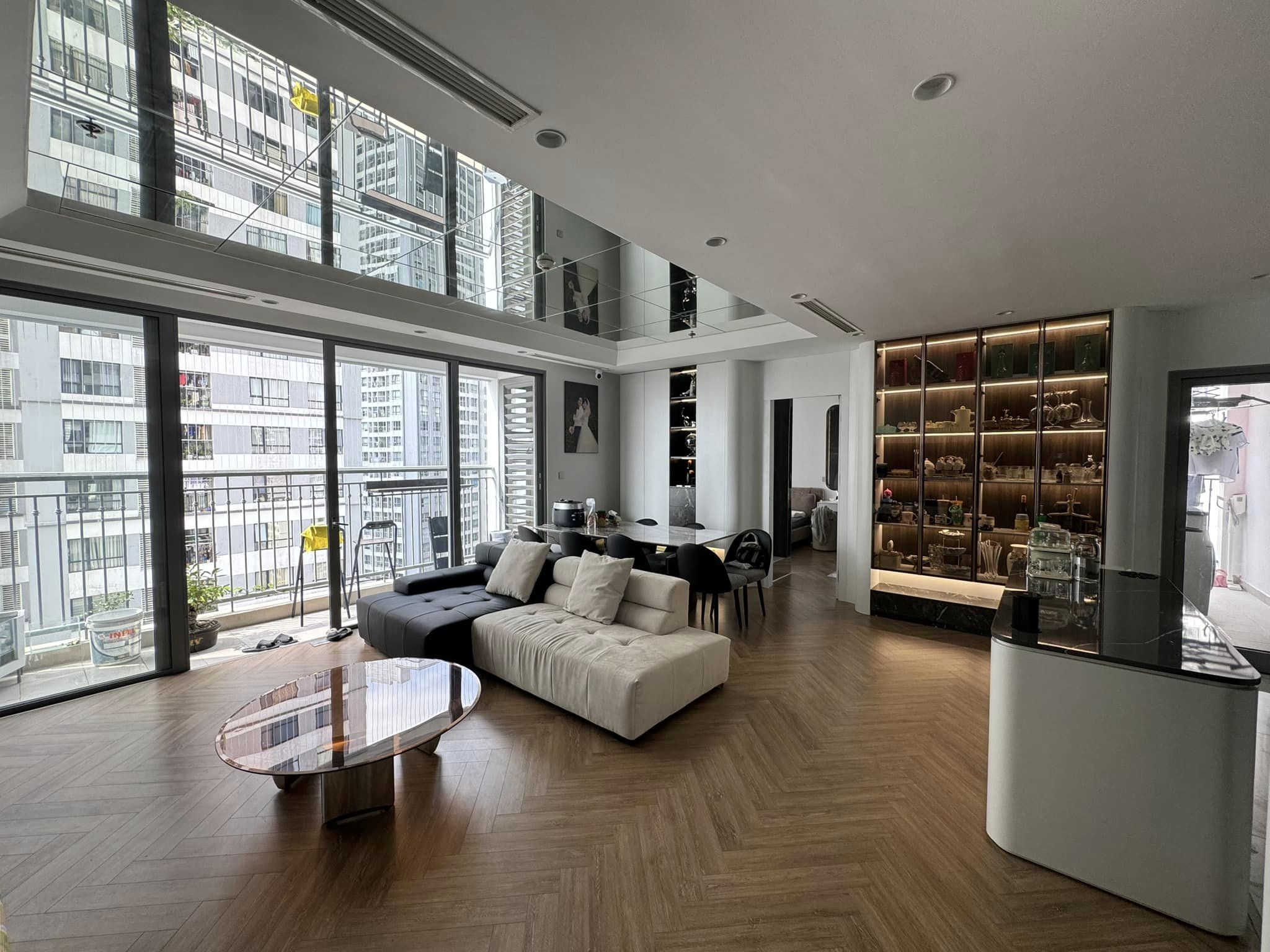 Điểm nhấn đặc biệt của căn hộ nằm ở phòng khách. Tại đây gia chủ đã lựa chọn lắp đặt gương trần – một lựa chọn rất phù hợp cho những phong cách nội thất đề cao tính hiện đại. Trước hết, việc lắp gương trên trần sẽ tạo cảm giác trần cao hơn, nhờ đó mà không gian sẽ có cảm giác rộng rãi hơn diện tích thật. Ngoài ra, gương cũng có tác dụng khuếch tán ánh sáng, giúp tận dụng được ánh sáng tự nhiên một cách tối đa.