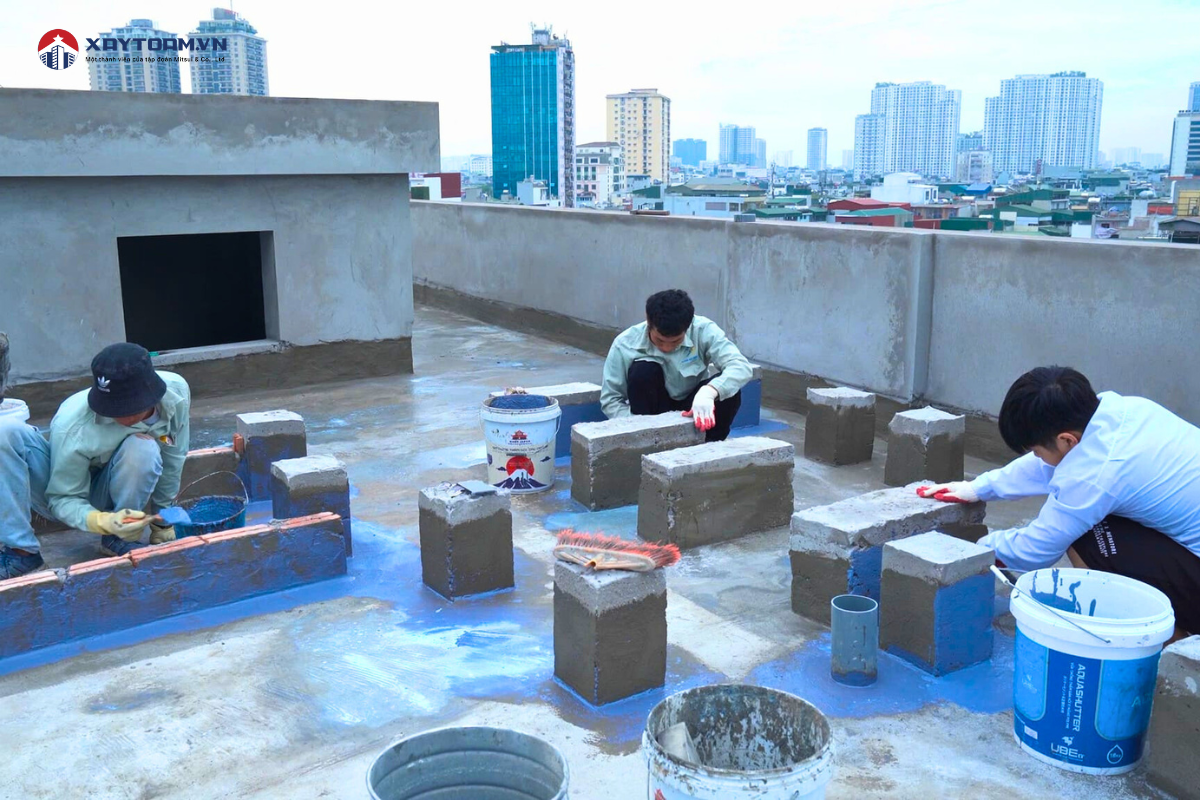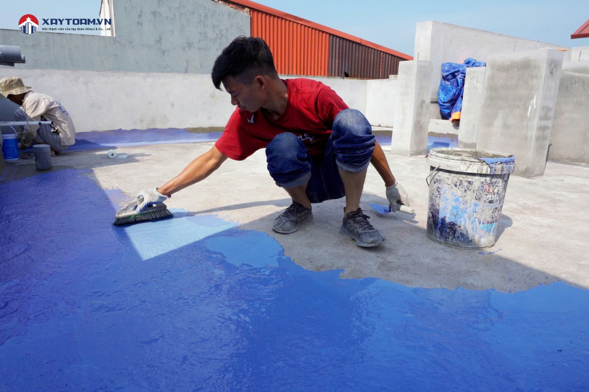 - Bước 2 - Thi công lớp chống thấm: Sử dụng vật liệu chống thấm chuyên dụng phủ đều lên toàn bộ bề mặt sân thượng. Nên quét từ 2-3 lớp để lớp chống thấm đủ dày để bảo vệ công trình khỏi những tác động của thời tiết. Có thể sử dụng bay, con lăn hoặc phun tùy theo loại vật liệu.