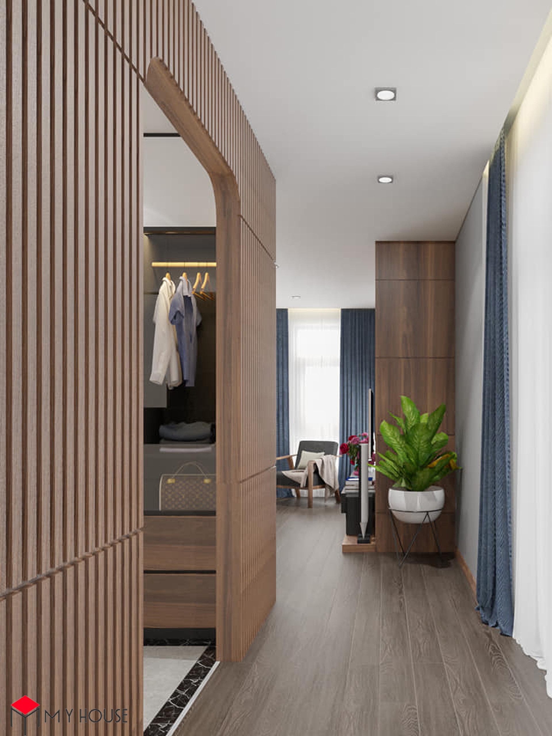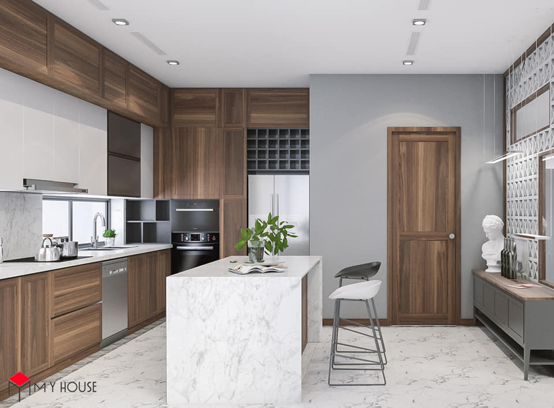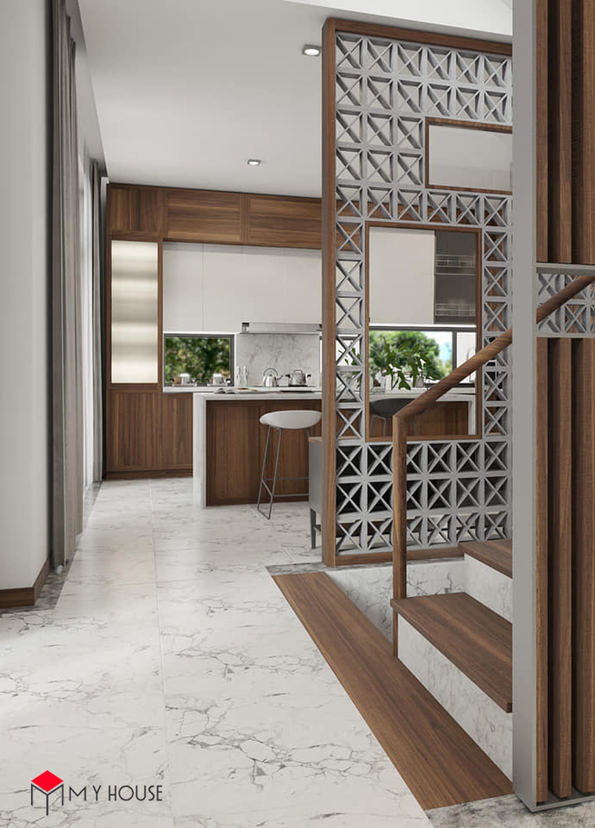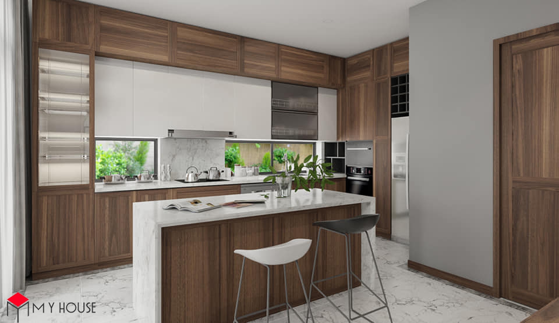 Các không gian đều được phối hợp nhịp nhàng giữa màu trắng và tông nâu của gỗ, điều này giúp căn nhà có cảm giác vừa ấm cúng, vừa vững chắc, sang trọng nhưng cùng lúc không bị cảm giác nặng nề. Khu vực bếp được thiết kế nhiều cửa sổ kính nhỏ để đón ánh sáng tự nhiên. Đặc biệt, hầu hết các phòng ngủ đều có một không gian đệm trước khi bước vào không gian chính với giường, tủ để giúp phòng ngủ có sự riêng tư và thoải mái tuyệt đối.
