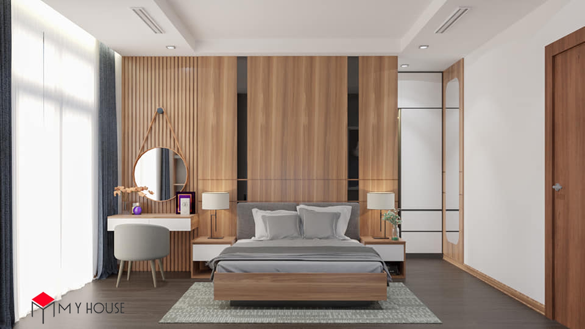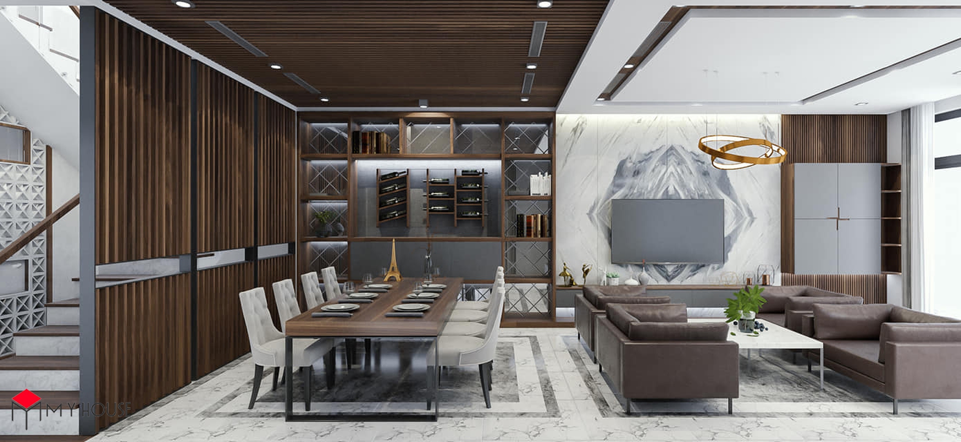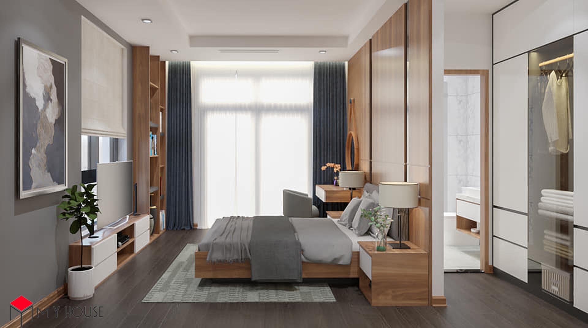 Các không gian đều được phối hợp nhịp nhàng giữa màu trắng và tông nâu của gỗ, điều này giúp căn nhà có cảm giác vừa ấm cúng, vừa vững chắc, sang trọng nhưng cùng lúc không bị cảm giác nặng nề. Khu vực bếp được thiết kế nhiều cửa sổ kính nhỏ để đón ánh sáng tự nhiên. Đặc biệt, hầu hết các phòng ngủ đều có một không gian đệm trước khi bước vào không gian chính với giường, tủ để giúp phòng ngủ có sự riêng tư và thoải mái tuyệt đối.
