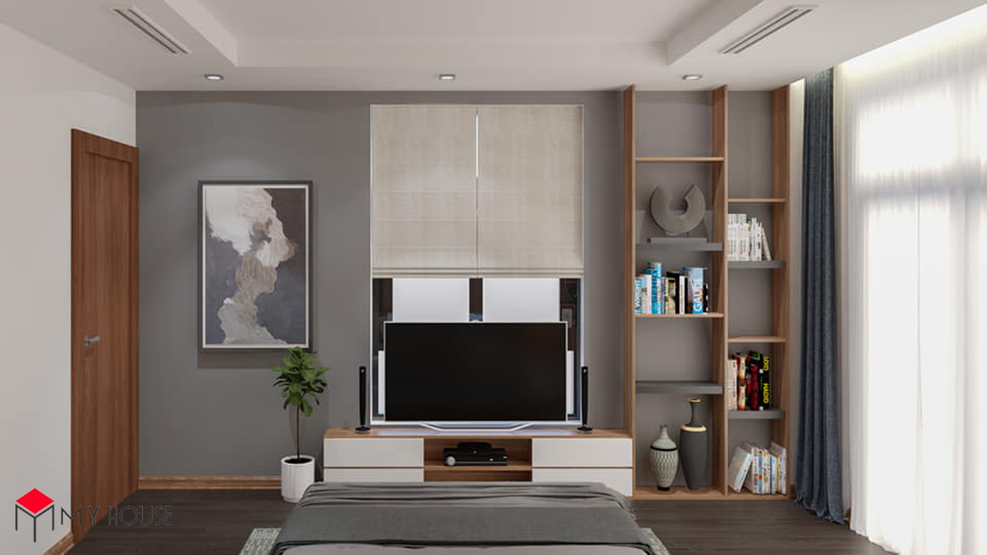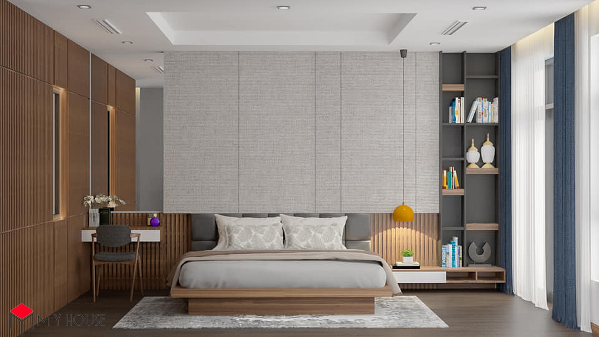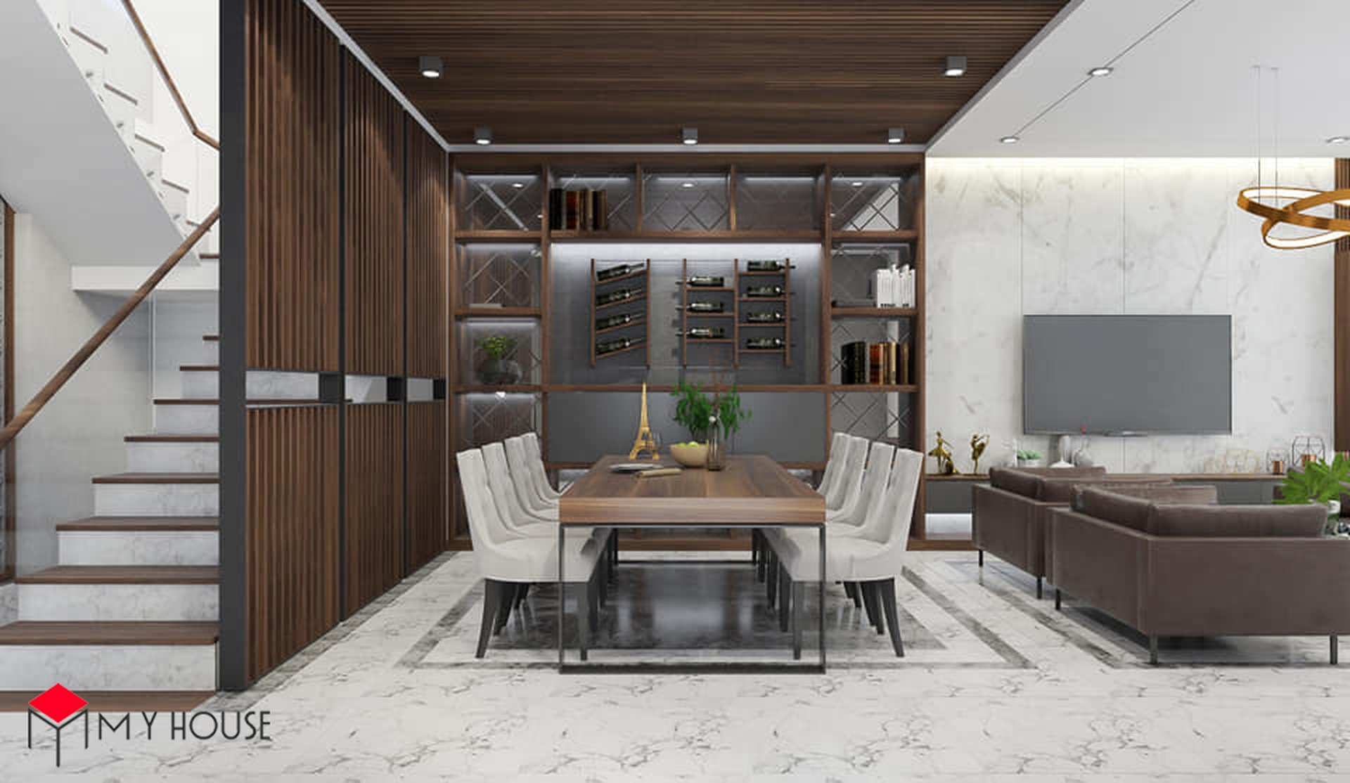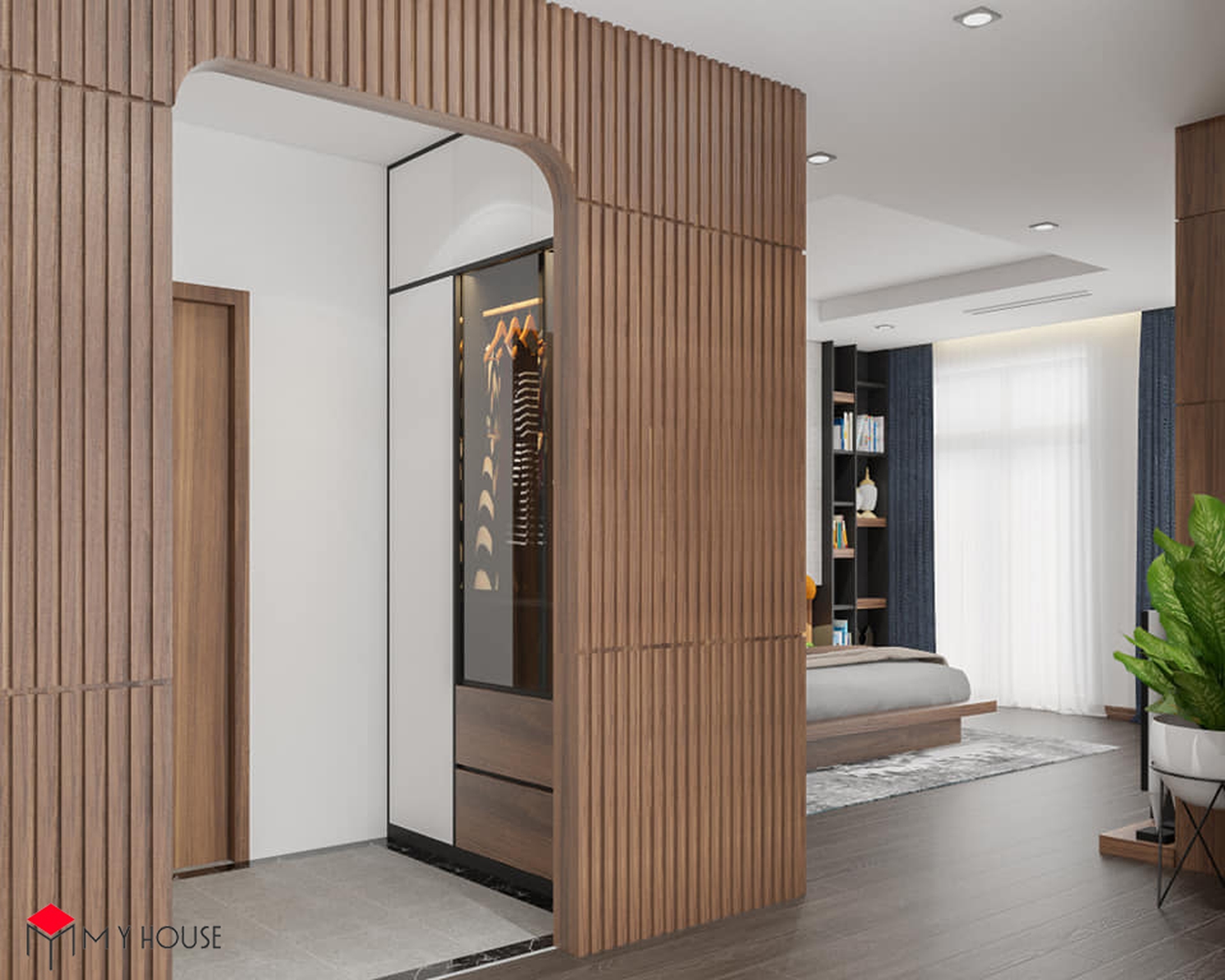 Các không gian đều được phối hợp nhịp nhàng giữa màu trắng và tông nâu của gỗ, điều này giúp căn nhà có cảm giác vừa ấm cúng, vừa vững chắc, sang trọng nhưng cùng lúc không bị cảm giác nặng nề. Khu vực bếp được thiết kế nhiều cửa sổ kính nhỏ để đón ánh sáng tự nhiên. Đặc biệt, hầu hết các phòng ngủ đều có một không gian đệm trước khi bước vào không gian chính với giường, tủ để giúp phòng ngủ có sự riêng tư và thoải mái tuyệt đối.