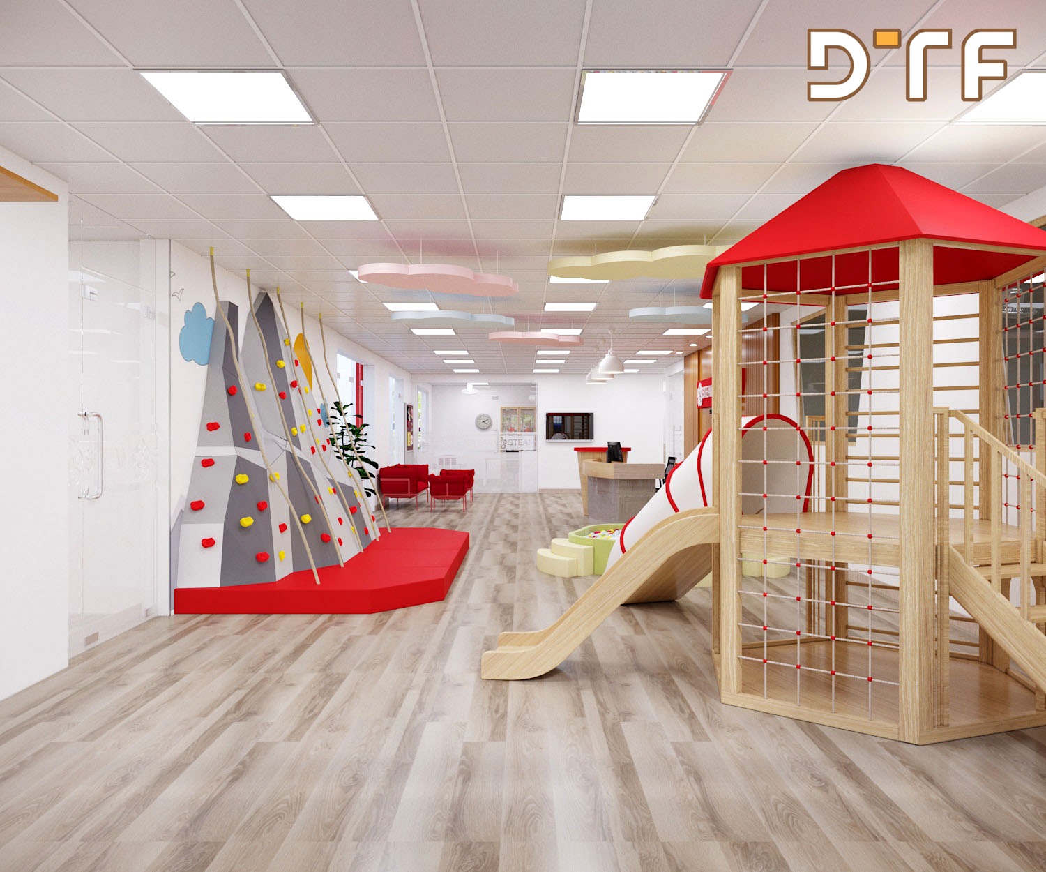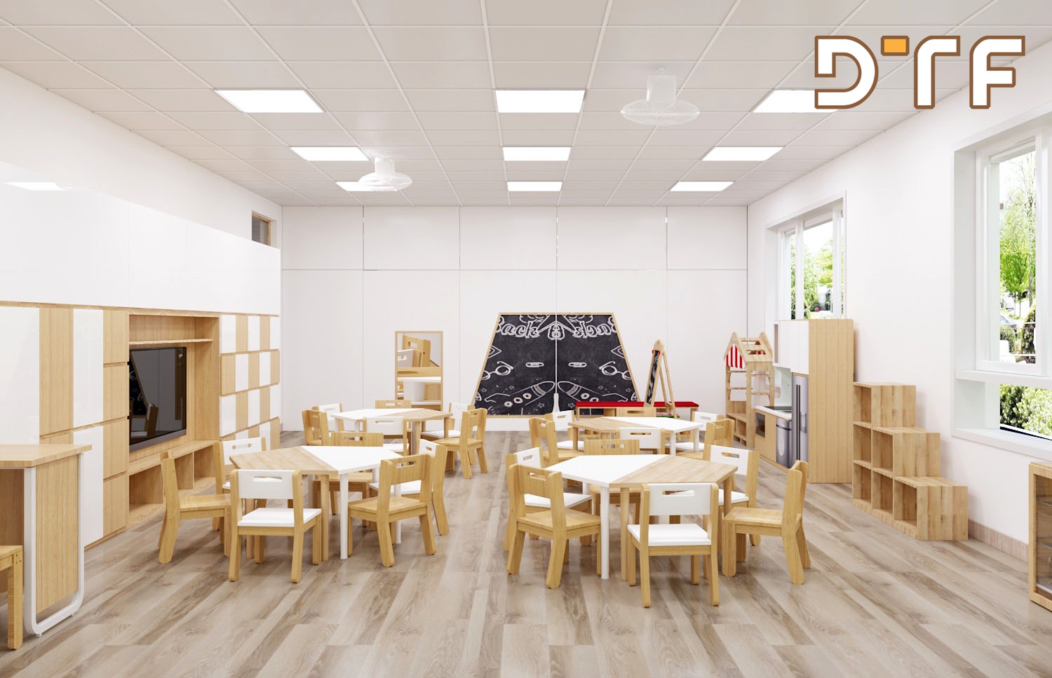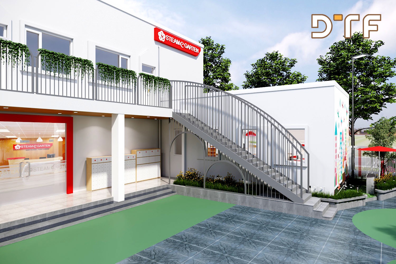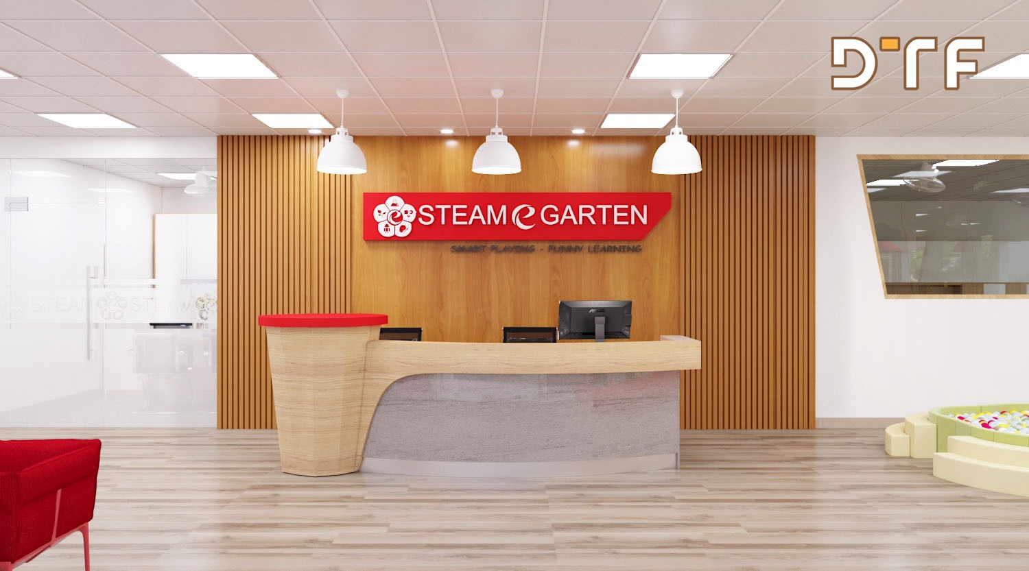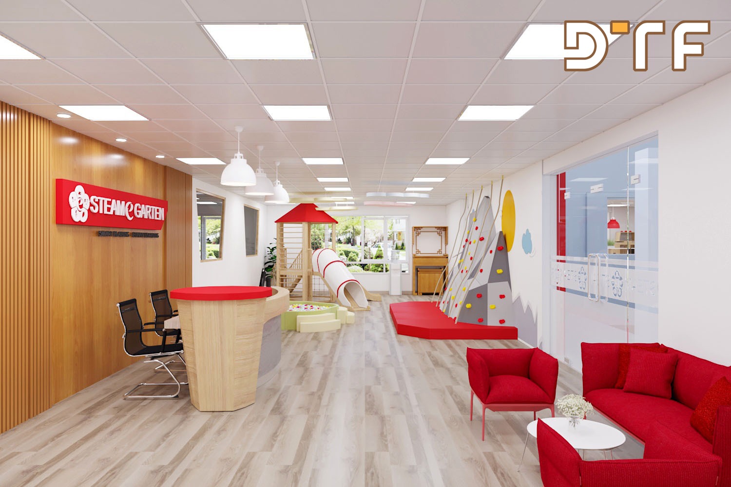 Trường mầm non STEAME GARTEN là hệ thống trường mầm non chuẩn 5 sao đầu tiên tại Việt Nam. Công ty thiết kế và thi công nội thất DTF Việt Nam vinh dự được giao trọng trách thiết kế, thi công hoàn thiện nội thất trường mầm non Steame Garten với diện tích hơn 1000m2 được chia thành 11 phòng học đầy đủ tiện nghi.