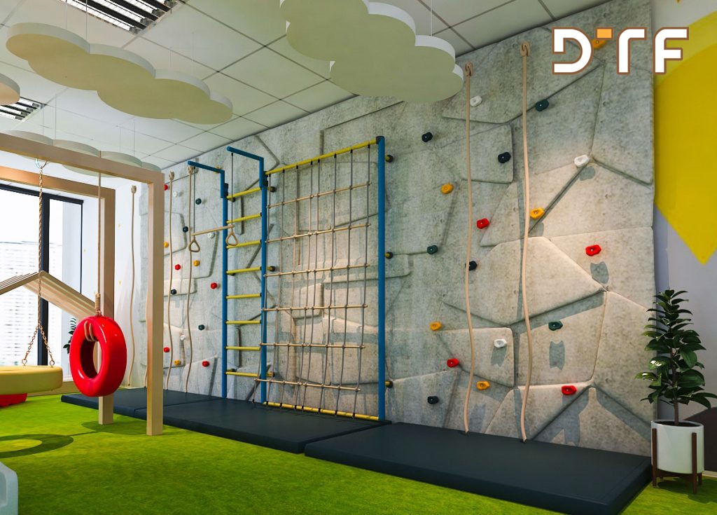 - Không gian mở: Khu vực học tập và vui chơi được bố trí rộng rãi, thông thoáng, tạo điều kiện cho trẻ tự do vận động và khám phá thế giới xung quanh.