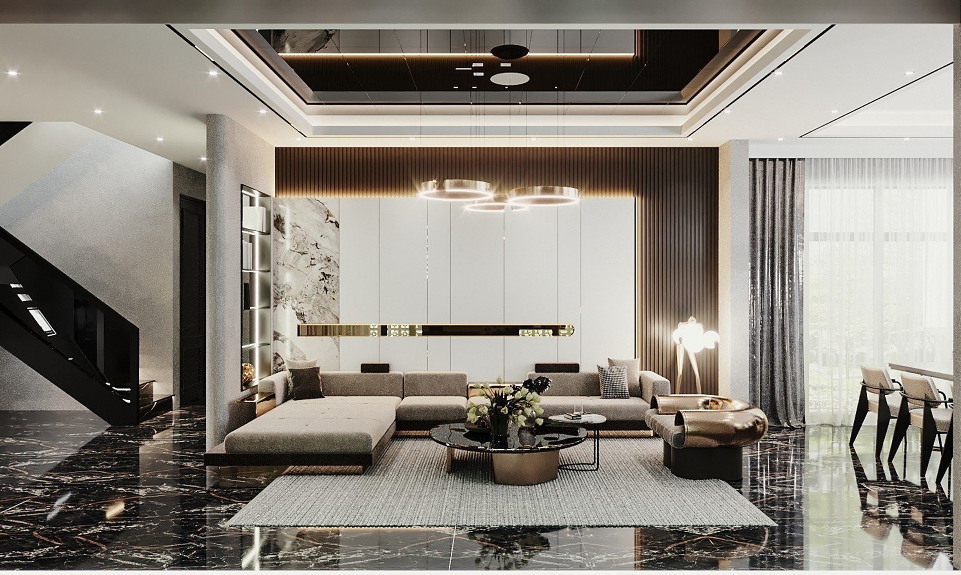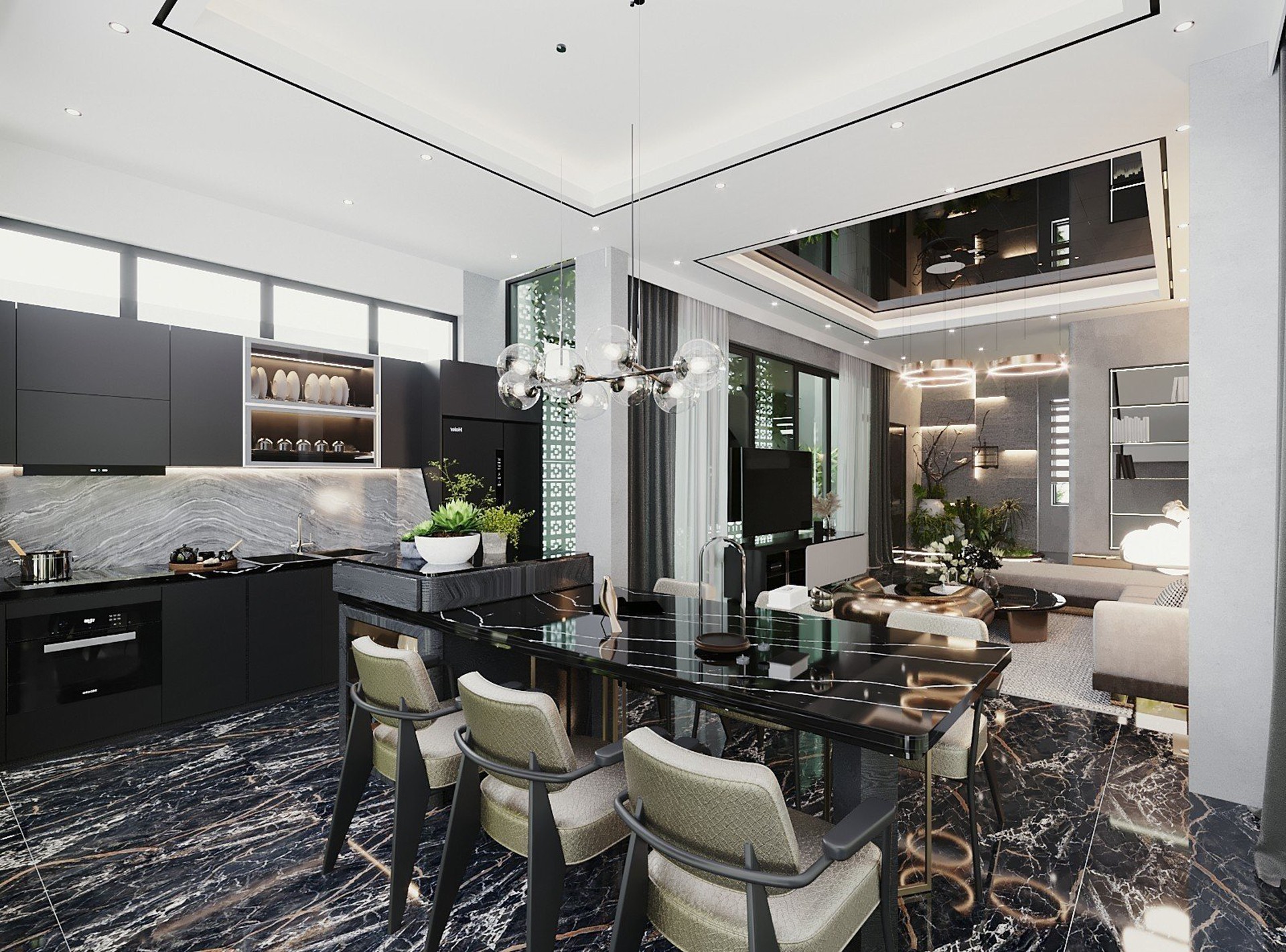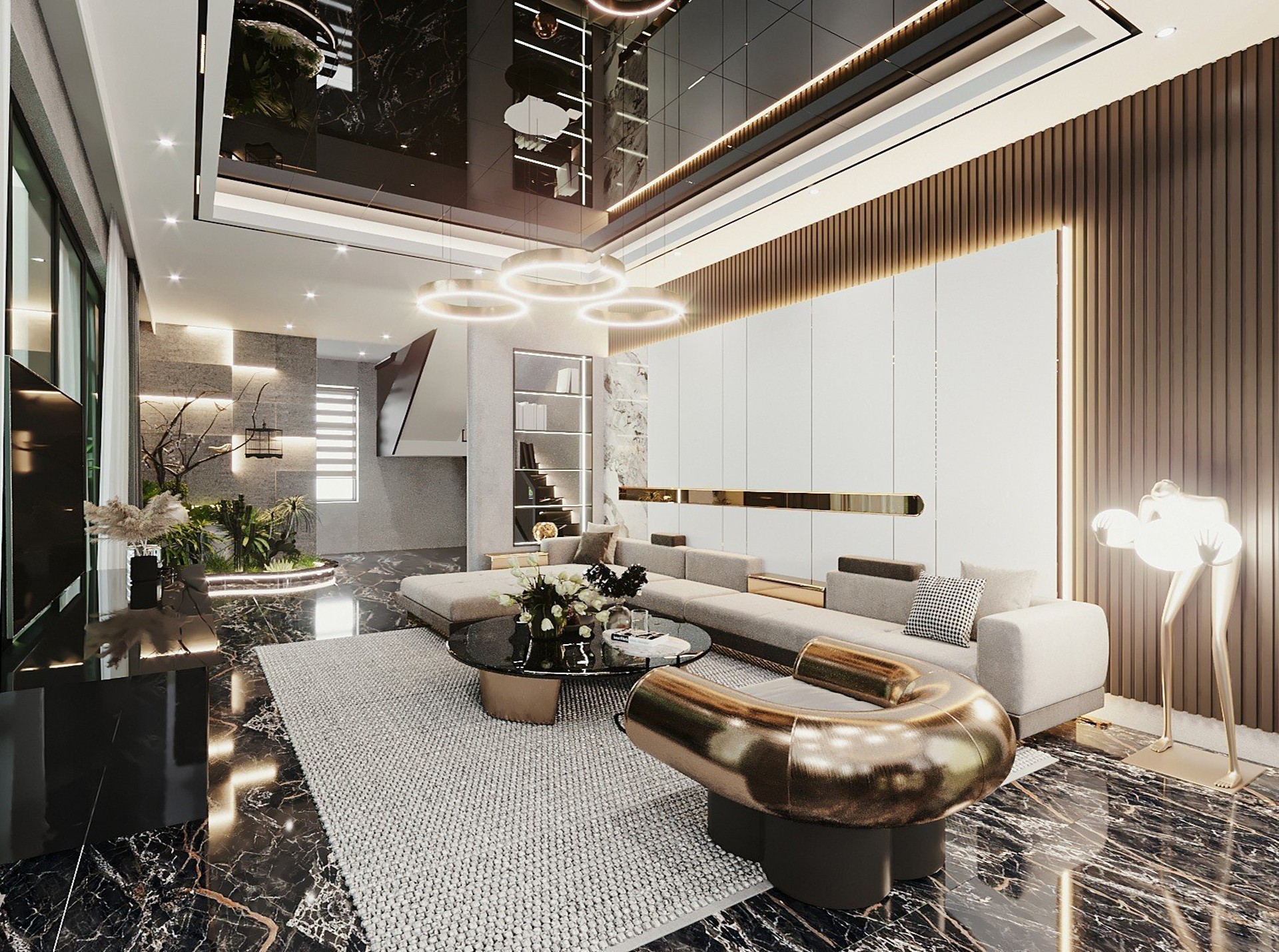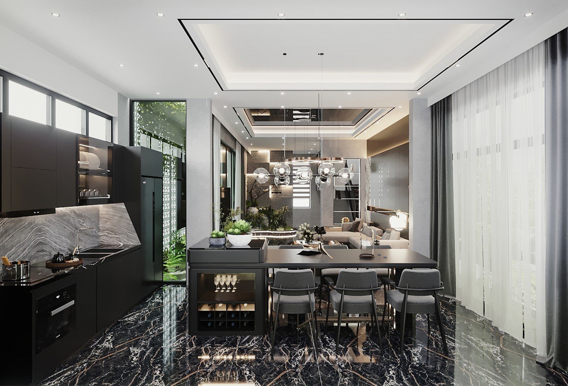 Công trình sử dụng Gỗ tự nhiên với tông màu đen làm chủ đạo, kết hợp với gỗ Công nghiệp MDF Thái Lan