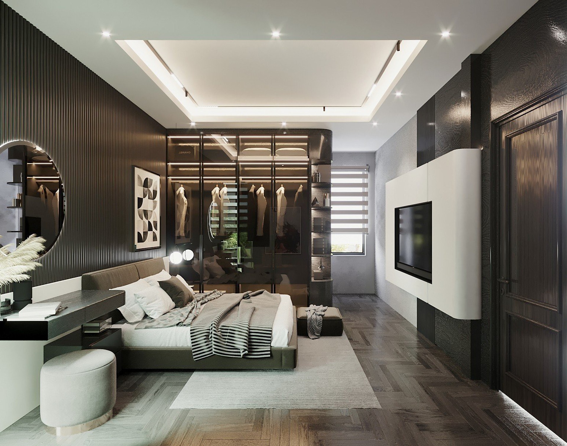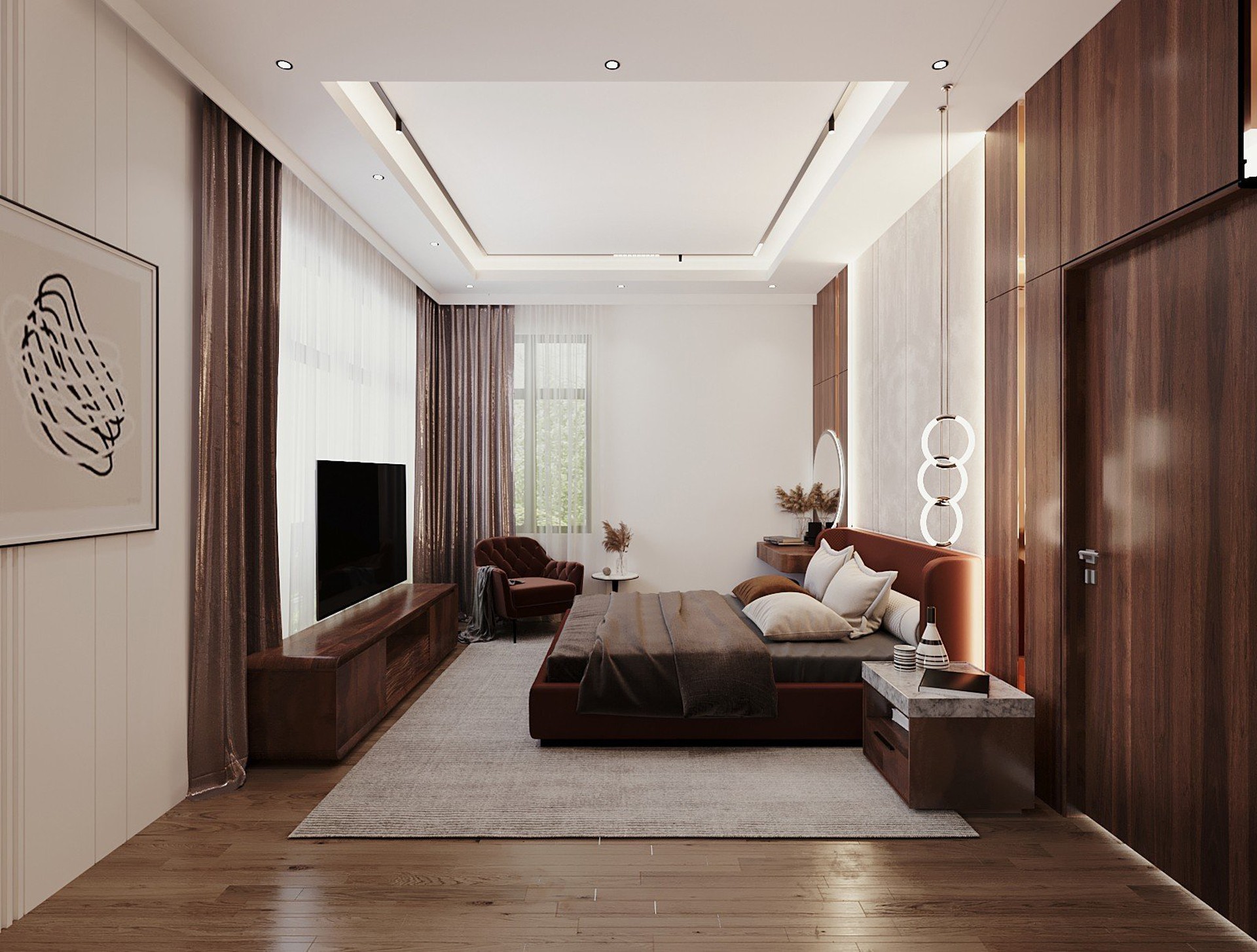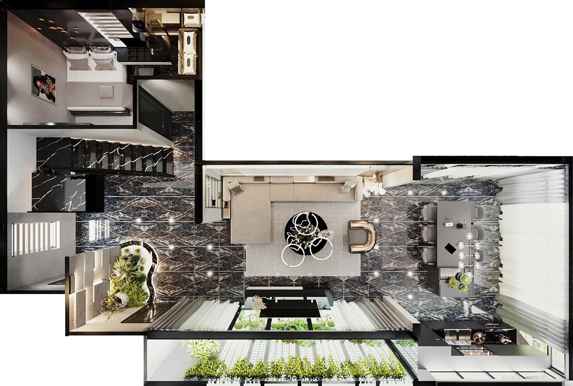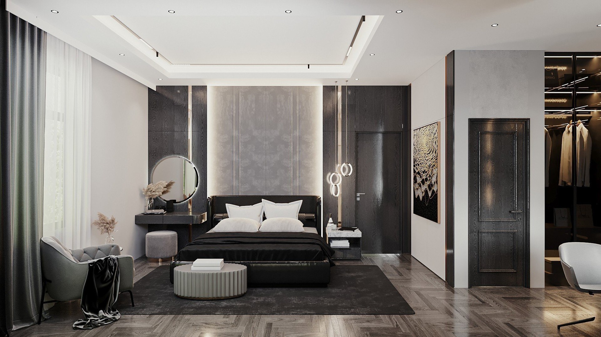 Công trình sử dụng Gỗ tự nhiên với tông màu đen làm chủ đạo, kết hợp với gỗ Công nghiệp MDF Thái Lan
